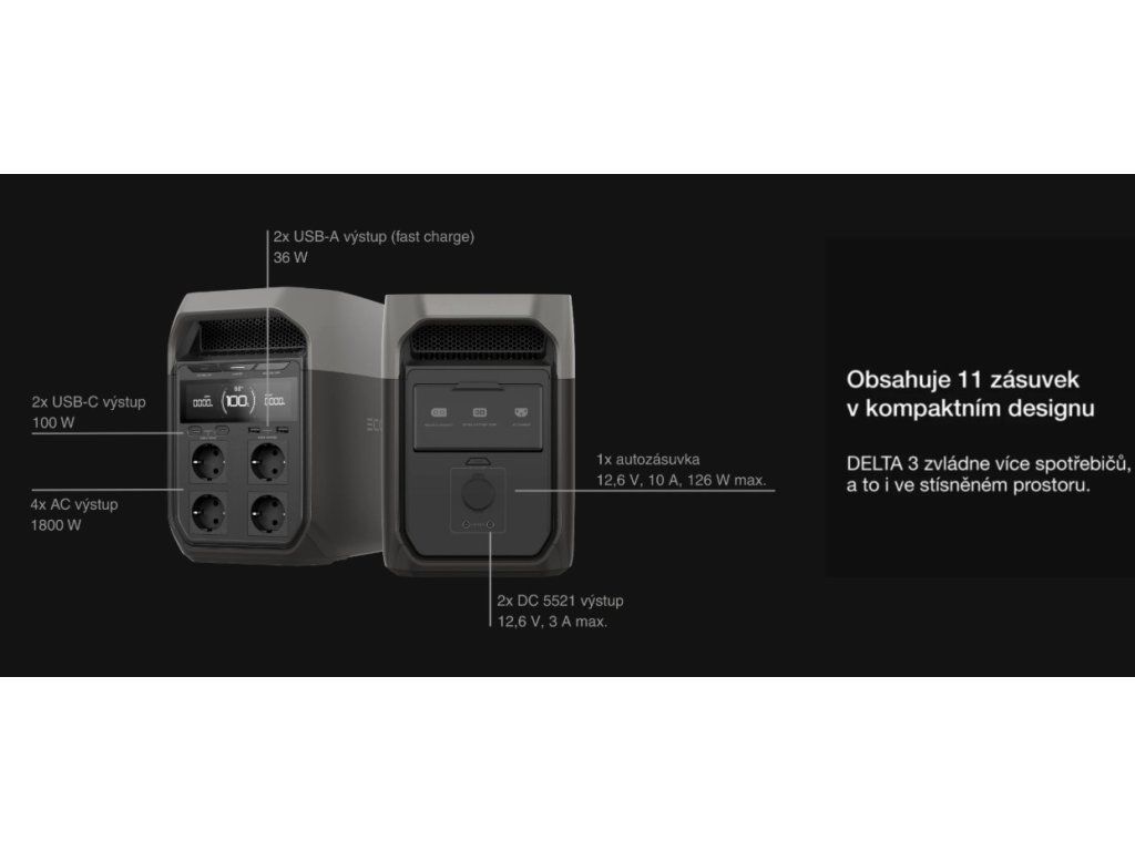EcoFlow DELTA 3 je přenosná bateriová stanice s akumulátorem LiFePO₄ a kapacitou 1024 Wh. Má několik výstupů, včetně 4 standardních zásuvek střídavého proudu, 2 portů USB-A, 2 portů USB-C, 12V DC portů a portu pro přídavnou baterii. Bateriovou stanicí lze napájet celou řadu spotřebičů a zařízení jako jsou chladničky, počítače, čerpadla na vodu do našich vestaveb i mobilní telefony. Různé možnosti nabíjení umožňují využívat jednotlivé způsoby podle aktuálních potřeb. Disponuje i velmi prostornou obrazovkou, která přehledně zobrazuje informace o jejím aktuálním provozu.