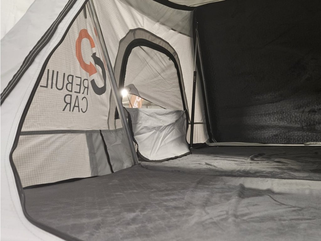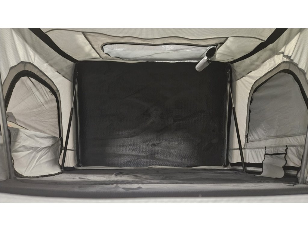 Střešní stan nabízí prostornou spací plochu 160 × 205 cm, která pohodlně pojme minimálně dvě dospělé osoby a jedno dítě. Díky velkorysému prostoru si tak můžete užít pohodlný spánek i během delších výprav.